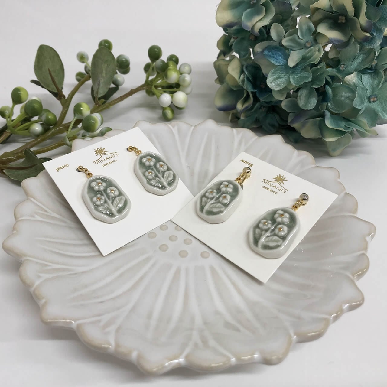 美濃焼タイルのピアス&イヤリング 花の絵(白)